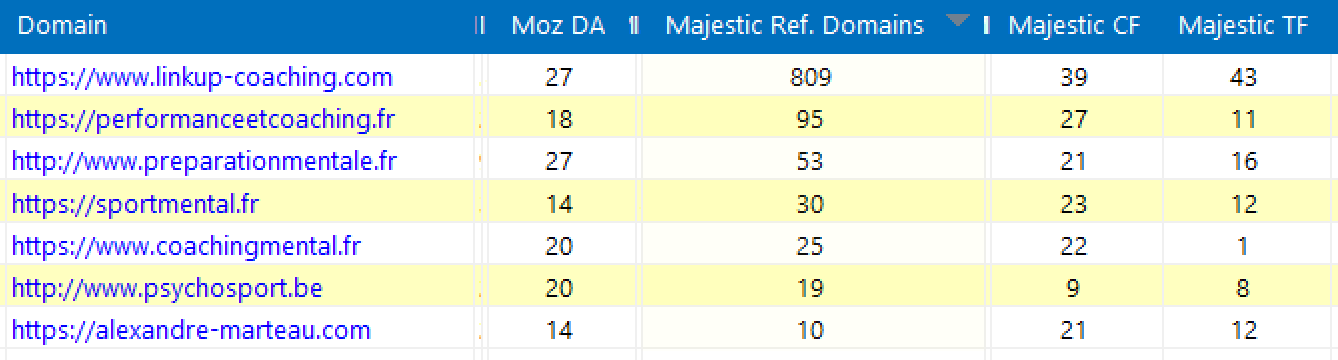 Par rapport aux concurrents positionnés sur les requêtes visées, coachingmental.fr se situe dans la fourchette basse avec seulement 25 domaines référents et un Trust de 1 (qualité médiocre)